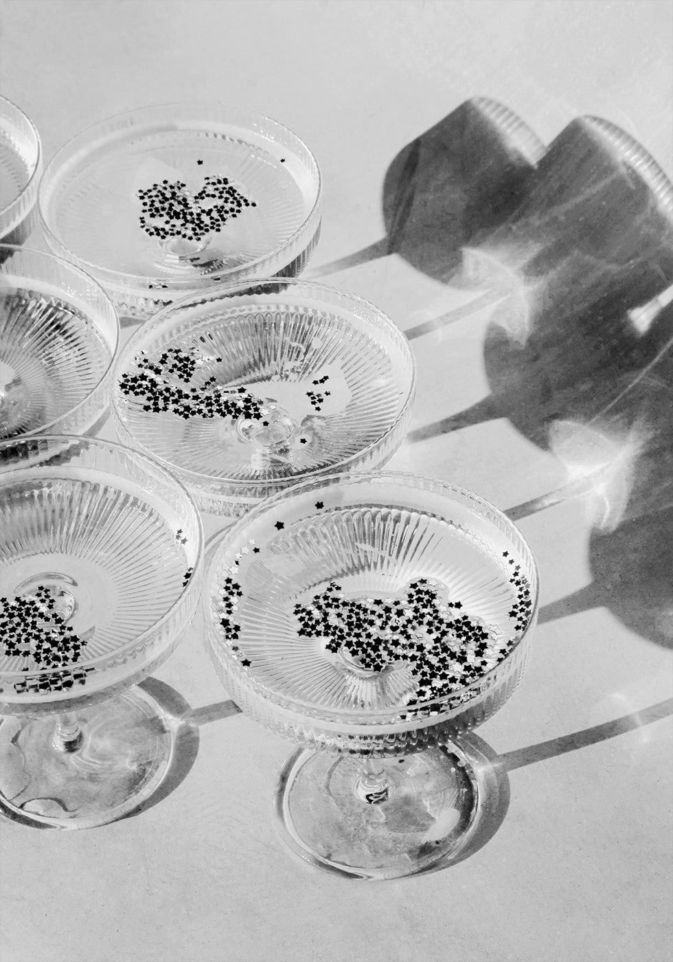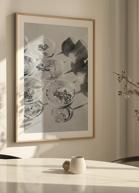 A sophisticated black and white poster that captures a moment of celebration with bubbly champagne glasses. This timeless photograph adds elegance and glamor to modern homes — ideal for the living room, bar or dining room.