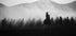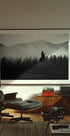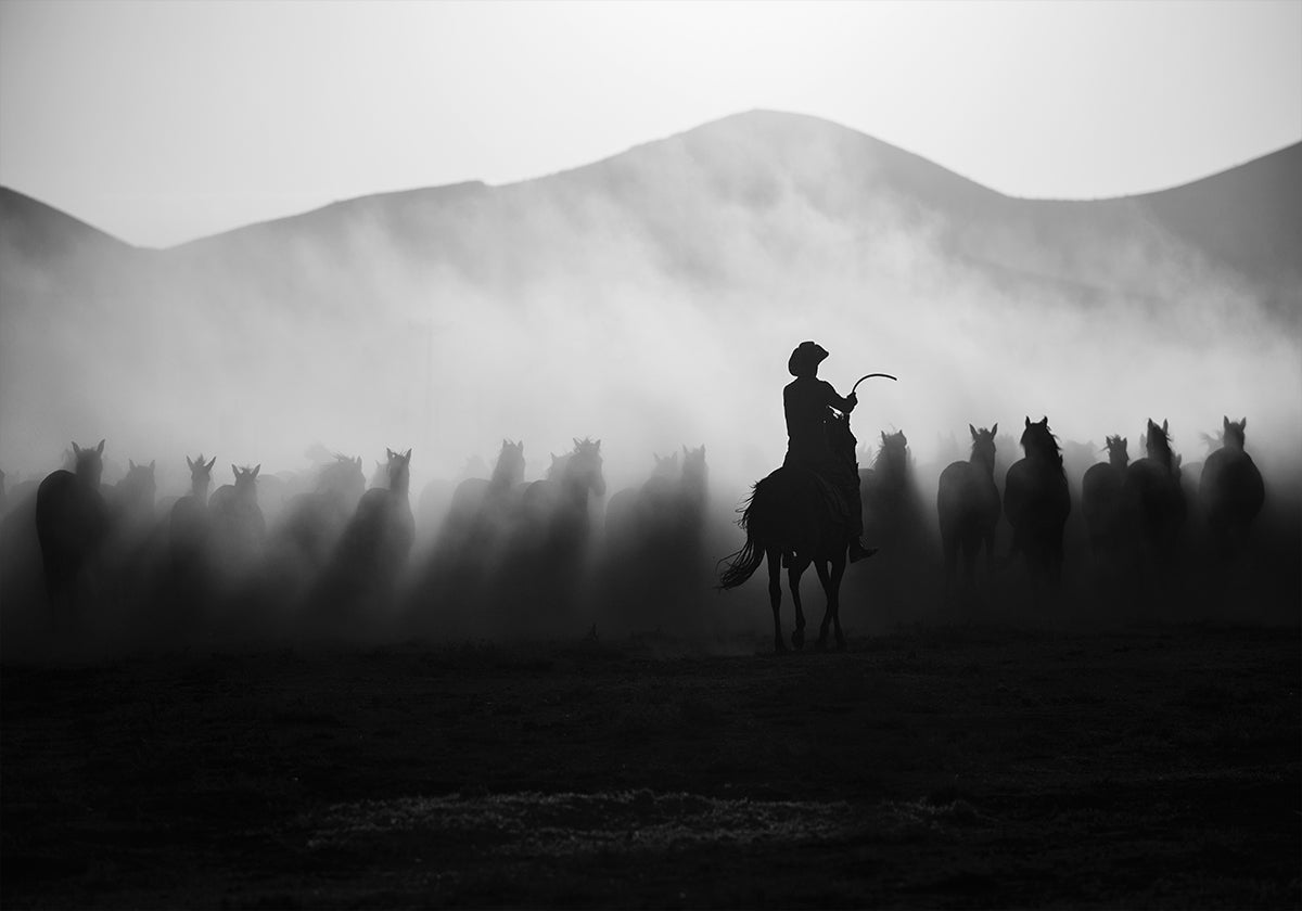A dramatic black and white photograph of a cowboy riding through a herd of wild horses, surrounded by fog and dust. With strong silhouettes and cinematic tones, this artwork captures freedom, movement and raw nature.
