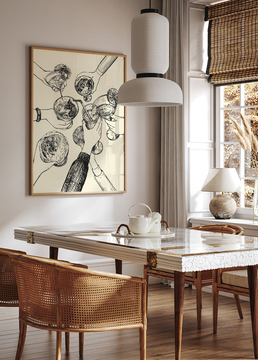 This 'Cheers' poster captures the festive and social spirit of raising a glass in a bowl. It is perfect for adding a lively and encouraging atmosphere to any space, whether at home, in the office or at a party. With its simple yet effective design, it acts as a perfect reminder to enjoy moments and celebrate life. An ideal decoration for those who love to gather friends and family for good times.