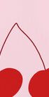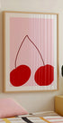 A playful and lively minimalist artwork with two distinctive red cherries on a soft pink background. With pop art style and clean lines, the piece adds a modern and fresh breath to the interior, perfect for kitchen, dining rooms and contemporary wall art.