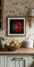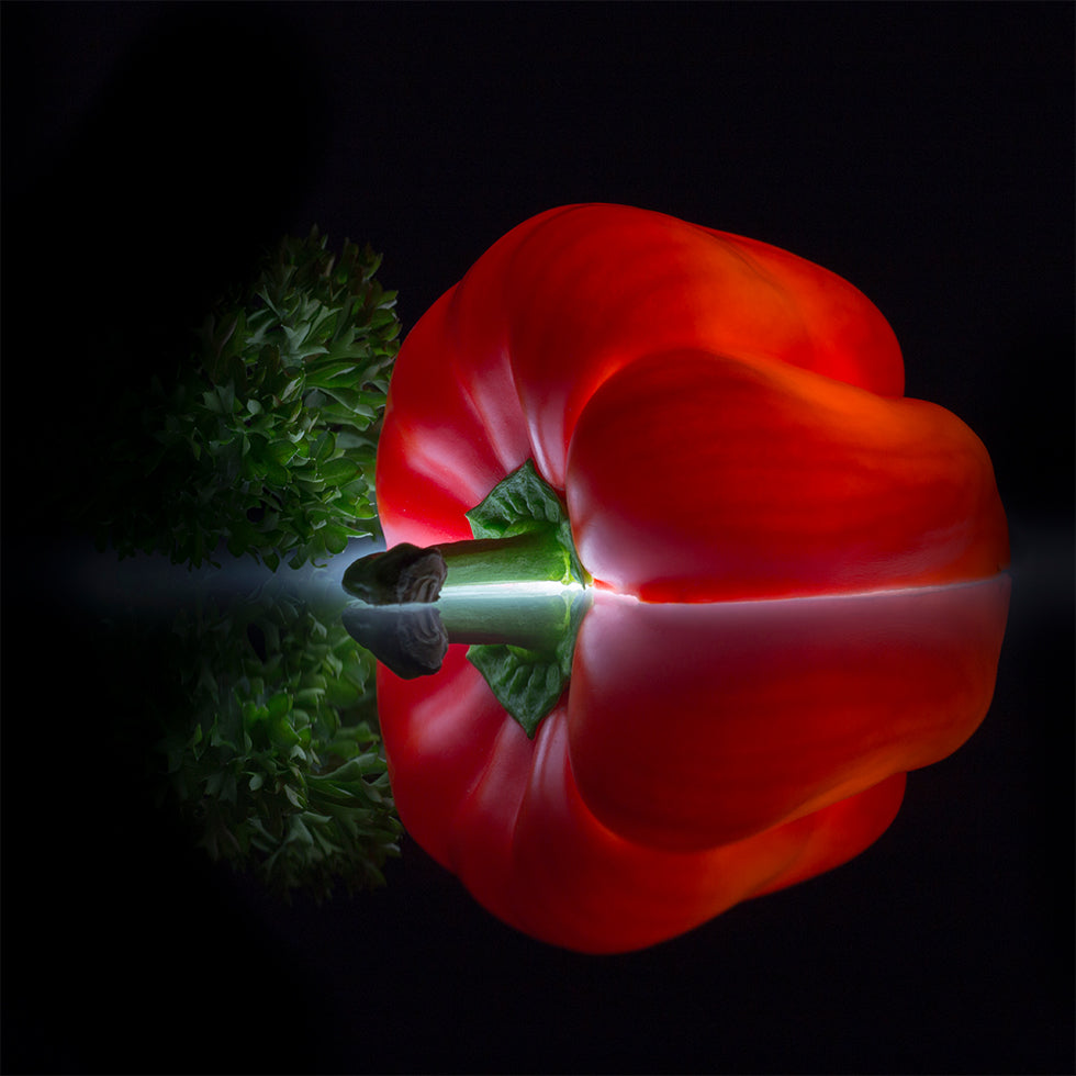 A juicy red paprika lies freshly chopped on a shiny, reflective surface, where light and shadow create a calm, modern composition. The fresh seed pieces and sharp edges provide energy, while the clean background creates balance. A stylish kitchen motif by Wieteke de Kogel, perfect for gastronomic spaces. And everyday poetry.
