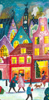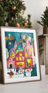 Experience the Christmas atmosphere in Caroline Bonne Müller's "Christmas in Amsterdam". A colorful illustration of snow-covered canal houses, decorated windows and a sparkling Christmas tree scene along the water. Dog and passers-by bring life to the snowy weather, while warm lights contrast the frosty night. A tribute to the city's winter magic and cozy streets.