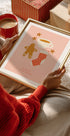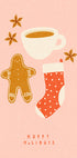 A warm and playful Christmas illustration by NKTN: a steaming cup of cocoa, a smiling gingerbread man and a striped Christmas stocking set the scene while snowflakes dance in the background. Soft, vintage-inspired color palette and humorous details give a cozy Christmas atmosphere to the living room, children's room or entrance hall. Perfect as a gift or for this year's winter fun.