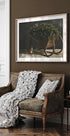 An atmospheric winter still life with a wooden sleigh, green branches and a small lantern. The dark shades and soft shadows give a calm, elegant and cozy Christmas look.