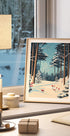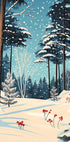 A peaceful winter illustration of a snowy forest with tall pine trees and falling snowflakes. Red berries add a festive touch to the tranquil landscape, perfect for Christmas and winter decorations.