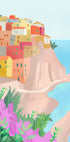 A charming watercolor inspired illustration of Cinque Terre, Italy. Pastel colored houses on the rocks overlooking the blue sea, surrounded by lush plants and flowers. A perfect motif for travelers and coastal decoration.