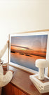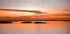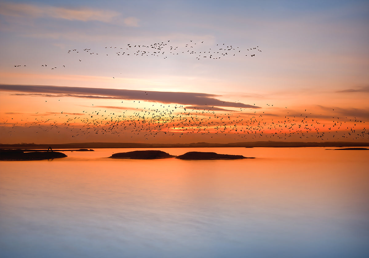 A stunning long exposure photograph of a sunset over still water, with a silky smooth surface glowing in shades of orange and pink. A flock of birds in elegant flight complete the scene, adding movement and depth to this tranquil seascape. Perfect for lovers of quiet, poetic landscapes.