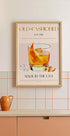 A retro-inspired poster of Old Fashioned cocktail with a whiskey glass, orange peel and ice cubes. With distinct typography and vintage design, this artwork celebrates the timeless American cocktail. Perfect as a kitchen decoration, bar poster or for the home bar.