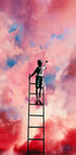 A surreal and inspiring artwork depicting a child climbing a ladder against a dreamy pink and purple sky. The figure appears to paint or reach into the clouds, symbolizing imagination, hope and creativity. Perfect as motivational wall art or as a striking centerpiece in a modern, colorful picture wall.