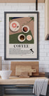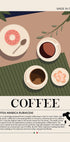 An Italian-inspired poster showing an outline of coffee cups, a dessert and sugar cubes on a table. The poster highlights the history and production process of coffee with a focus on the Italian espresso tradition. Perfect for cafes, coffee lovers and enthusiasts of Italian culture.