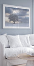 Cold morning by Nina Pauli depicts a quiet winter morning, where a lonely tree silhouette stands in frozen ground, shrouded in fog. The soft, cool sunrise colors the sky in delicate shades, while frost and snow muffle the sounds. A calm, meditative motif that invites contemplation and reflection. Perfect for quiet rooms.
