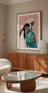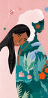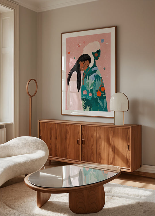 A symbolic and modern illustration showing two women surrounded by cosmic elements and lush nature. The artwork expresses themes such as protection, motherhood, friendship and harmony between people and nature.