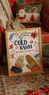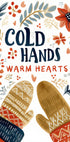 This image shows a cozy and warm winter illustration with the text “Cold Hands, Warm Hearts” in the middle. Around the text there are painted flowers, leaves and small decorative elements in warm red, orange and golden tones combined with cool blue shades. At the bottom you can see two mittens in different patterns and colours, which emphasize the winter atmosphere. The overall impression is warm, Christmassy and full of loving winter coziness.
