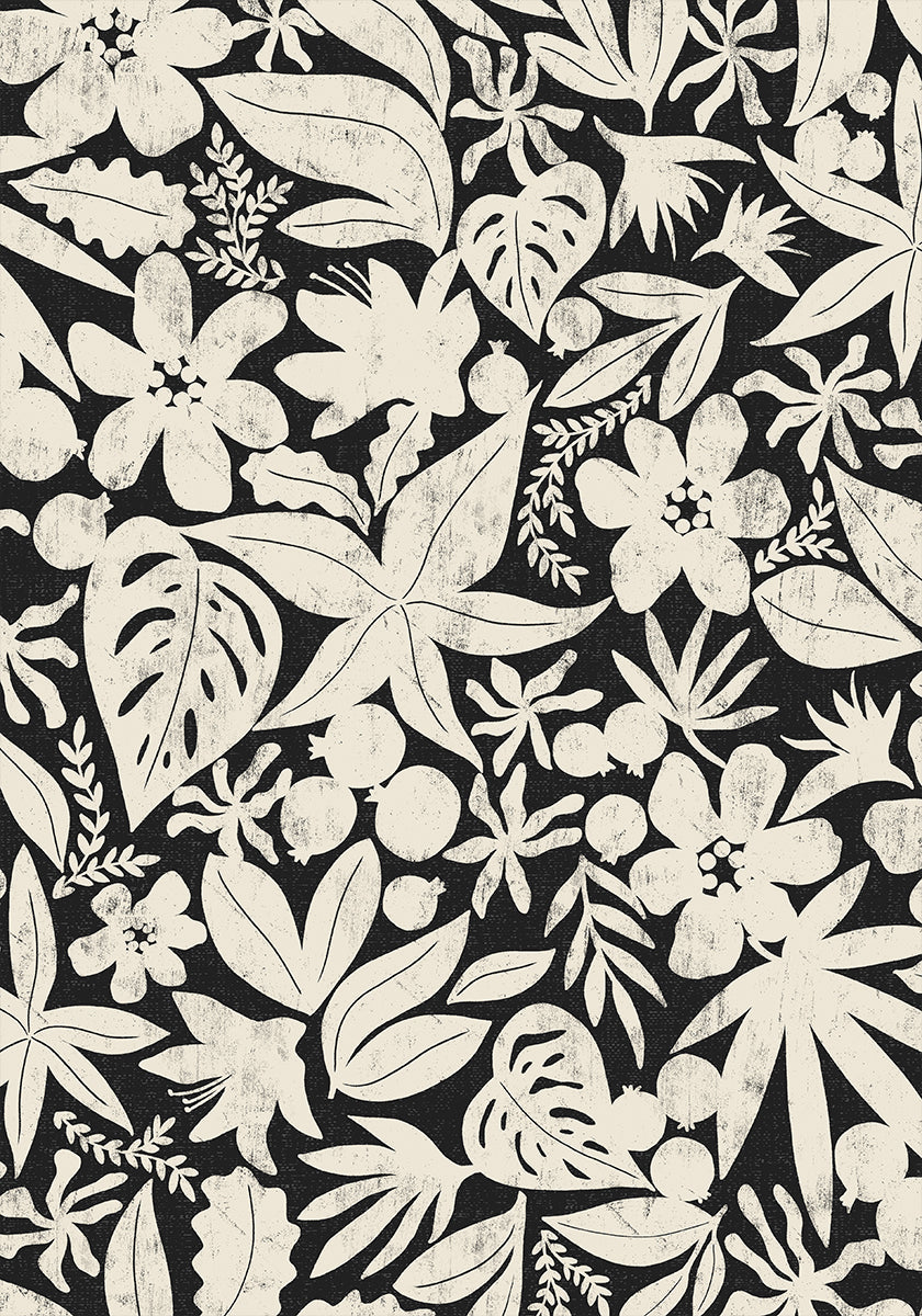 Cozy by Dana Ďuričeková combines modern minimalism with the poetry of nature: a hand-drawn, black-and-white motif with graphic silhouettes of leaves, flowers and fruits. The strong contrasts and fine textures create calmness and presence that are perfect for both Nordic, tropical and artistic spaces. A stylish statement for the entrance hall, living room or office.