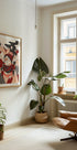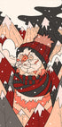 A cozy winter cat takes the stage in a snowy landscape, where soft flakes fall over quiet mountains in the background. The warm, cartoonish style spreads Christmas cheer and calm, perfect for the living room in the cold season. A charming illustration by Stephen Wade that captures both play and whimsy. A winter postcard for the wall.