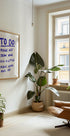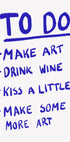 A playful and motivational typography piece with a handwritten "To Do" list: Make art, drink wine, kiss a little, make more art. With bold blue text on a white background, this fun and modern poster combines humour, romance and creativity – perfect for couples, artists or anyone who loves to live with passion.