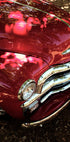 A striking close-up of a vintage Chevrolet in deep red, with shiny chrome details and polished lines. This nostalgic car photograph captures the elegance of classic cars from the 1950s, with sunlight and surroundings reflected in the glossy surface. Perfect for car enthusiasts, collectors and lovers of retro design.
