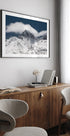A calm winter landscape unfolds in clear, bluish tones: majestic snow-capped peaks rise above misty valleys, while soft clouds drift across the sky. The clean, cool atmosphere invites contemplation and tranquility. A poetic look at the strength and silence of the mountains, created by Xiaoyang Wang. Perfect as a quiet focal point in the living room.