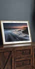A dramatic moment on the black sands of Iceland, where the waves wrap themselves silky smooth around clear pieces of ice like diamonds at dusk. The fleeting traces of water provide calm and movement at the same time and invite contemplation. Created by photographer Raymond Hoffmann, who captures Nordic winter poetry. An eye-catcher for the living room, office or gallery wall.