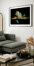 A striking close-up of a red-eyed tree frog (Agalychnis callidryas) perched on a green stem against a deep black background. The vibrant green body, orange feet and bright red eyes create a fantastic composition full of color and mystery. This macro nature print is perfect for animal lovers, nature lovers or those who want bold and exotic wall art