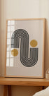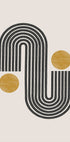 A modern minimalistic abstract design with bold black curved lines forming arcs combined with golden circular shapes on a simple background. Combining retro mid-century aesthetics with contemporary style, this geometric artwork makes a perfect statement for modern interiors.