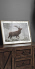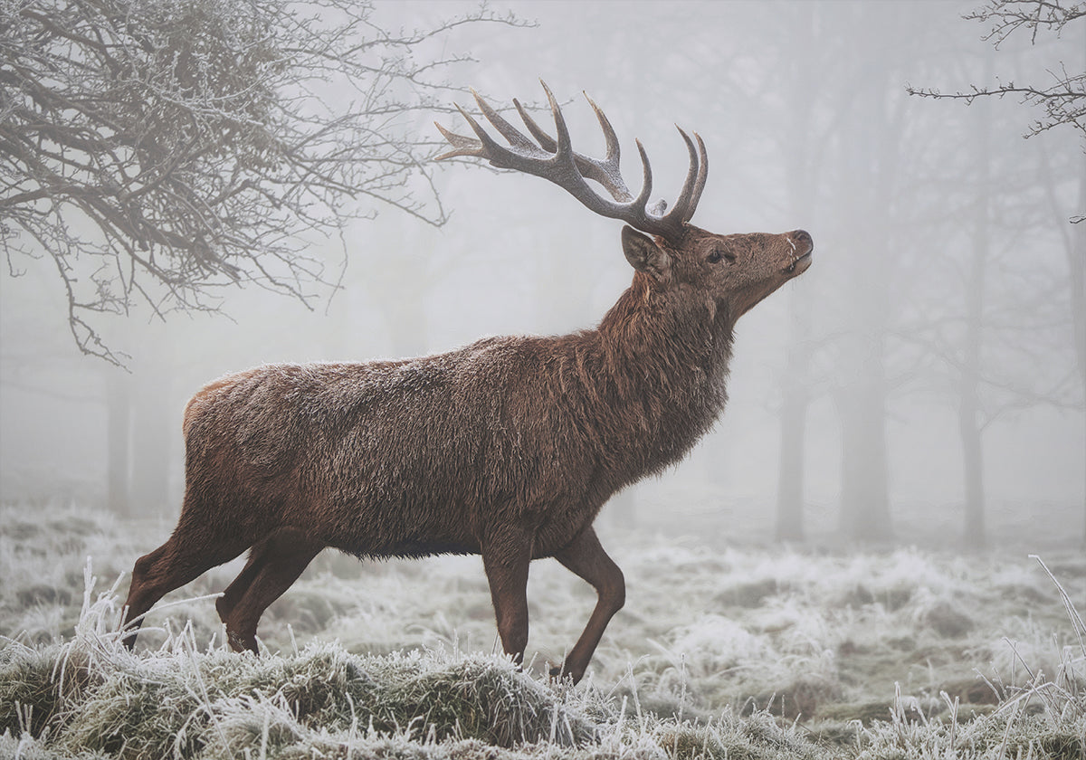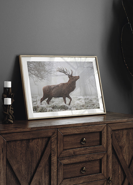A majestic stag stands on a frosty winter morning, the steam hangs in the air and the pale light of the sun draws the silhouette of powerful antlers. The cool tones and the quiet atmosphere give the room Nordic calm and natural elegance. Photo art by Cristian Vasile, created for living room, bedroom or office. A silent tribute to wild animals.