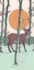 Deer In The Forest by Nicholas is a minimalist poster featuring a proud deer standing calmly among slender birch trees in a frosty forest landscape. Muted green and cream tones meet graphic lines and a gentle sunlight, creating a Japanese-inspired calm atmosphere for the living room, bedroom or office.