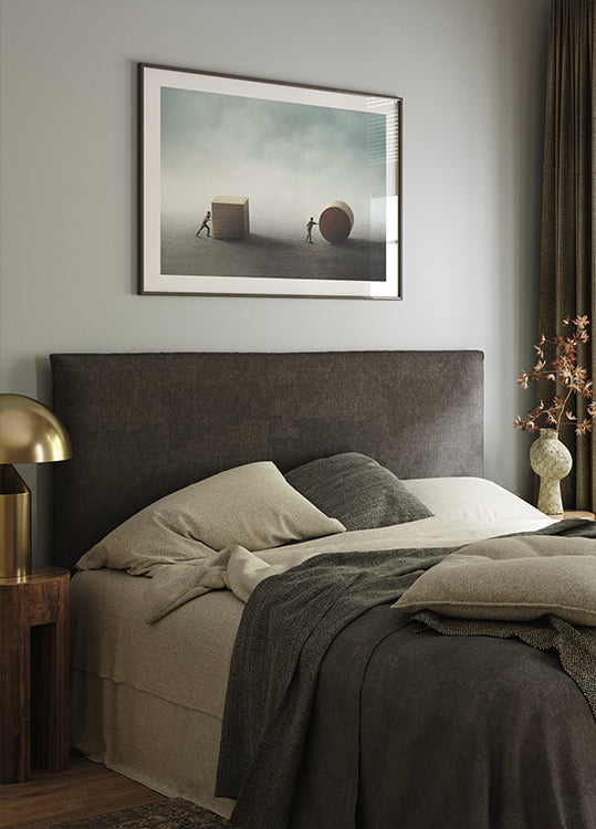 A thought-provoking surreal artwork depicting two small figures pushing different shapes—a cube and a cylinder—symbolizing effort, strategy, and innovation. This inspiring image represents problem solving, progress, and the many paths to success. Perfect for modern office environments, creative studios, or motivational spaces.