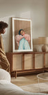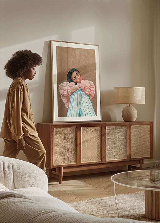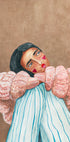 A figurative watercolor and mixed media painting depicting a dreamy young woman with expressive features. Her face is decorated with heart shapes and surrounded by soft pastel colors that combine sensuality, thoughtfulness and artistic elegance. The work contains a balance between vulnerability and strength, and creates a distinctly modern portrait.