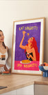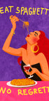 A bold and playful illustration of a glamorous woman enjoying spaghetti and red wine with the humorous phrase "Eat Spaghetti, No Regretti". The artwork combines humor, femininity and style, and is perfect as a statement in the kitchen, dining room or as a modern wall decoration.
