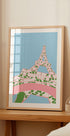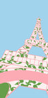 A modern and lively illustration of the Eiffel Tower in Paris, decorated with playful green floral patterns on soft pink lines against a clear blue sky. This artwork gives a fresh, feminine and stylish twist on one of the world's most iconic landmarks, perfect for feminine interiors, travel-inspired spaces or as a statement piece on the wall.