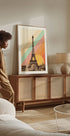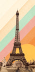 An eye-catching retro-inspired illustration of the Eiffel Tower in Paris, set against a bold rainbow-striped background with a warm golden sun. The combination of vintage photography and vibrant graphic design creates a nostalgic yet modern travel-inspired artwork, perfect for lovers of Paris, architecture and colorful wall decor.