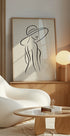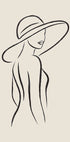 A graceful, minimalist line drawing of a woman wearing a broad-brimmed hat, captured in an elegant side-facing pose. The simple black lines on a soft beige background create an effortlessly chic and timeless fashion illustration — perfect for modern interiors and stylish gallery walls.
