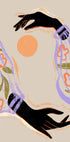 A modern figurative illustration of two black hands reaching towards a glowing orange sun. The arms are adorned with floral sleeves in soft pastels, creating a poetic blend of botanical beauty and abstract minimalism. The work symbolizes harmony, energy and connection to nature.