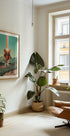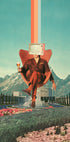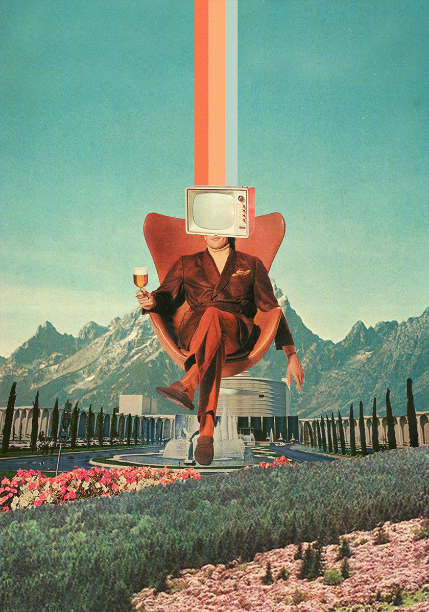 A surreal digital collage of a man in retro attire sitting confidently in an orange lounge chair with a glass of wine in hand. His head is replaced by an old television that projects colored streaks into the sky. The scene combines futuristic architecture, mountain landscapes and floral details, creating a distinctive mix of retro nostalgia and surreal fantasy.