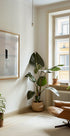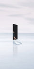 A surreal conceptual artwork depicting a person stepping through a dark door over calm, reflective waters. The minimalist arrangement, with a staircase leading into nothingness, evokes themes such as escape, departure and new beginnings. The scene mixes dreamlike surrealism with midcentury-inspired aesthetics.