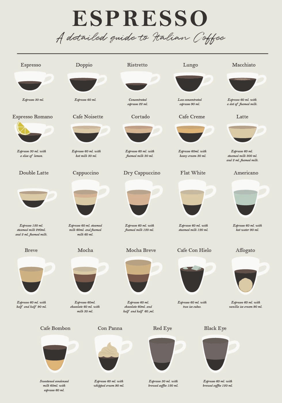 The "Espresso Guide Poster" is a beautifully illustrated overview of various "Italian coffee drinks", from the classic "Espresso" to the "Flat White", "Macchiato" and more. With a minimalist design and stylish typography, this is the "perfect gift for coffee lovers, home baristas and cafe decor". Whether you are a coffee enthusiast or a beginner, this guide will help you understand the perfect coffee combination. Ideal for "the kitchen, coffee station or cafes".