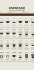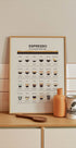 A detailed espresso poster with an illustrated overview of classic Italian coffee drinks. From espresso and doppio to cappuccino, latte and affogato – this kitchen poster is both educational and stylish. Perfect wall art for cafes, coffee shops and home kitchens.
