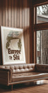A vintage tribute to alpine travel: snow-capped peaks rise above dark pine forests, while a red cable car glides over the piste. Retro typography calls to Europe's iconic ski resorts—from Chamonix and beyond. Muted green and brown tones meet sharp winter white and awaken pure travel fever. Perfect for winter dreams.