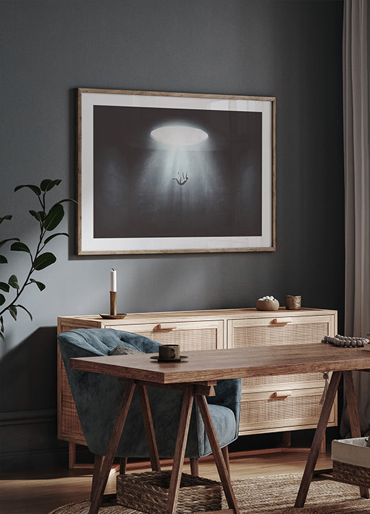 Falling from the Lighthole** poster is a captivating surreal artwork that captures the moment of free fall into the unknown. A lone figure floats down from a light opening, a strong symbol of transition, reflection or an escape from darkness. Perfect for modern interiors, meditation rooms or as a thoughtful statement poster.