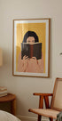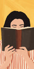 A warm and inviting illustration of a woman deeply engrossed in a book, set against a rich yellow background. The striped shirt and earth tones add a cozy, modern charm — perfect for reading nooks, libraries or any space that celebrates the joy of books.