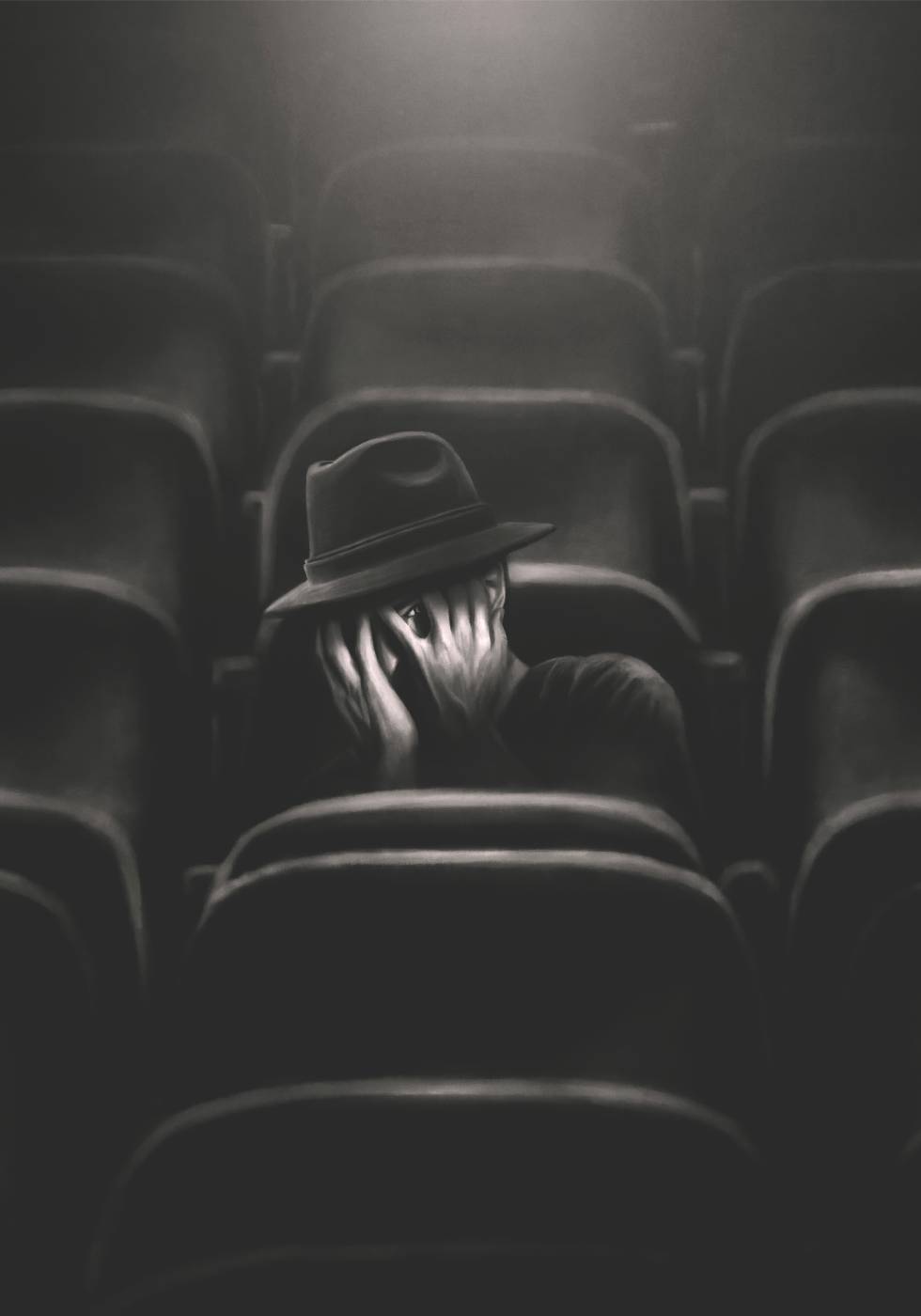 An intense, black-and-white work showing a man alone in an empty cinema, with his head buried in his hands and one eye peering out. A symbol of anxiety, surveillance and existential loneliness.