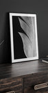 A single feather hovers in the darkness, drawn in stark black and white contrast. The fine rays are crystal clear and form a poetic trail of lightness and calm. The deep black background provides negative space and focus, so that the motif becomes a stylish, timeless eye-catcher with Nordic minimalism and quiet movement. Perfect as a calm focal point in modern interior design.