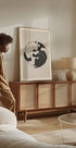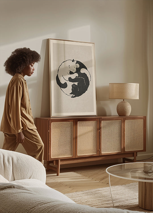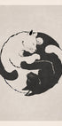 A minimalist black and white art poster featuring two cats lying together in a yin-yang formation, symbolizing balance, peace and harmony. A contemporary piece perfect for cat lovers and those who appreciate a calm, modern design.