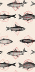 A modern art poster with detailed fish illustrations combined with geometric red shapes. Repetition and symmetry create a unique pattern that unites nature with abstract geometry, making this a striking piece of modern wall art.