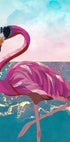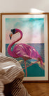 A playful and colorful art poster featuring a pink flamingo wearing chic heart-shaped sunglasses by the sea. With strong shades of pink, blue and magenta, this tropical illustration exudes holiday vibes and summer fun – perfect for beach lovers.