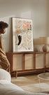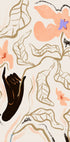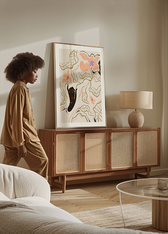 A modern abstract artwork with hand-drawn flowers in warm peach and apricot tones. The figurative black hand creates contrast and depth, and forms a poetic connection between man and nature. This expressive botanical motif combines modern country style with artistic minimalism, ideal as wall art.