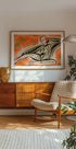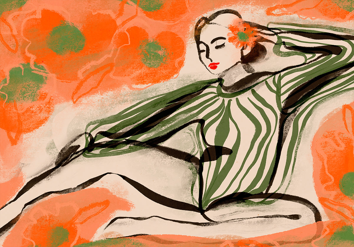 Floral Serenity by Treechild unites figurative poetry and botanical beauty: a stylized female figure in a calm pose surrounded by flowers and soft leaves. Graphic lines and a slightly painterly texture meet in a retro palette of green, orange and red, creating harmonious balance and timeless elegance. Perfect for Nordic decor.