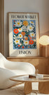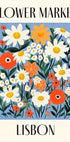 A charming retro poster with daisies, poppies and wild flowers in warm orange, white and yellow shades on a blue background. Inspired by Lisbon's vibrant flower markets, this artwork captures European travel nostalgia and botanical beauty.
