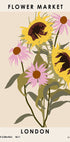 A charming floral poster with golden sunflowers and soft pink flowers. This modern, vintage-inspired piece of art celebrates London's floral splendor and the lively atmosphere of summer.